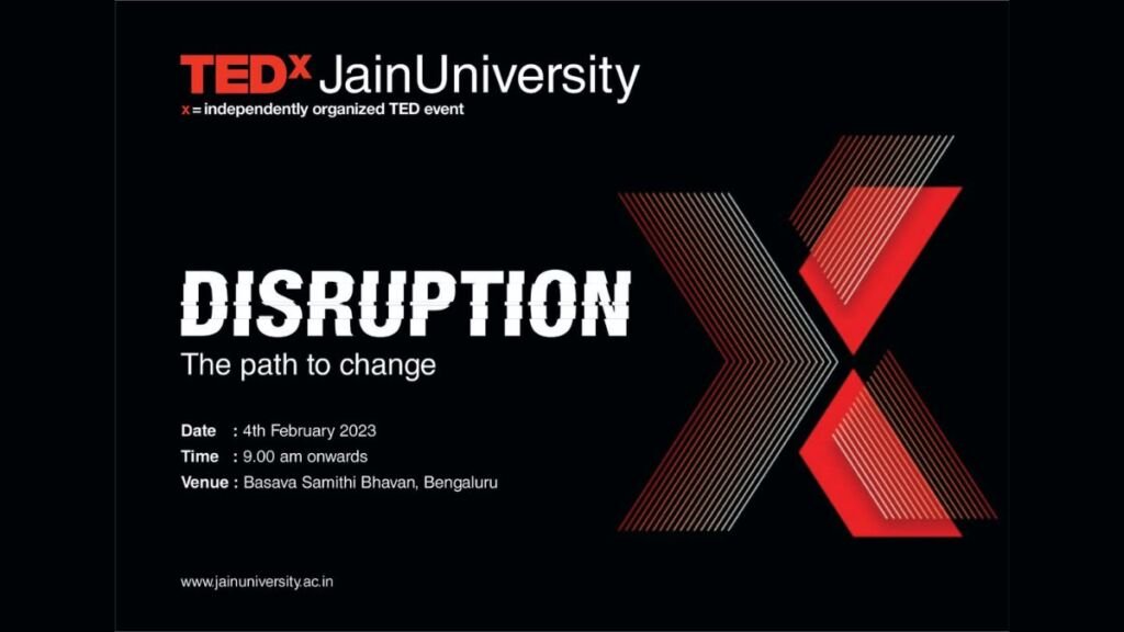 Bengaluru (Karnataka) [India], January 20: JAIN (Deemed-to-be University), one of the top-ranked private universities in India, is organizing the 3rd edition of TEDx Jain University on “Disruption – The Path to Change” on 4th February 2023 from 9 AM – 4 PM at Basava Samithi Bhavan, High Grounds, Sampangi Ramanagar, Bengaluru.