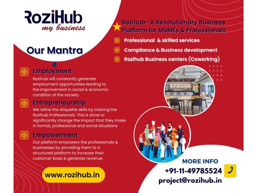New Delhi (India), February 1: New Delhi-Headquartered with a strong base in Mumbai and other cities of India, acclaimed IT and e-commerce platform, RoziHub empowers professionals, certified skilled workers, and MSMEs worldwide with work opportunities, business development and compliance support, and co-working Bizcentres infrastructure on one single platform. As the first and only platform in Asia serving 3-in-one services under one platform, RoziHub strives to become the one-stop solution with the provision of world-class infrastructure and services for generating work opportunities in the most hassle-free way.